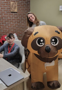 I’m Jonah and I’m in 5th grade. I saved up Clipper Tickets for the whole year to get the Principal for the Day pass! This morning my assistant and I walked around the school checking in with classrooms. The week before vacation, the PTO and our school collected donations for dogs and cats. Team Woof got the most donations so my assistant had to wear this costume! Thank you for all the donations!
